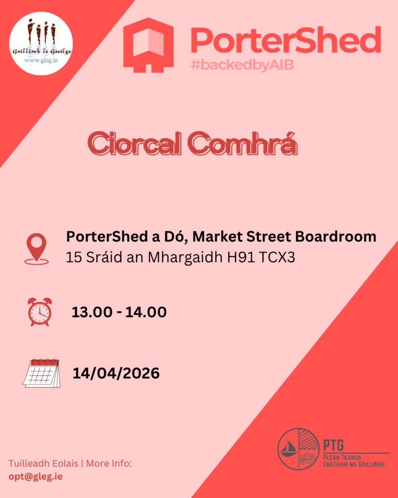 Beidh Ciorcal Comhrá ar siúl Dé Máirt, 14 Aibreán 2026 ó 13:00 go dtí 14:00 sa Market Street Boardroom, PorterShed a Dó, H91 TCX3. 💚 Beidh fearadh na fáilte roimh fhoghlaimeoirí agus roimh dhaoine gur mhaith leo snas a chur ar a gcuid Gaeilge. 💬 RSVP chuig [email protected] 📩